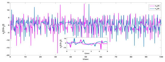 Next, from the matrices and we get Hence, is verified by using the Jacobian matrix (5). The chaotic behavior of the states and and and and of the drive-response systems (13) and (14) with fractional order are given in Figure 5, Figure 6 and Figure 7.
