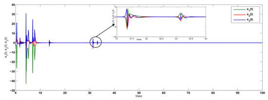 From Theorem 1, system (13) is synchronized with (14) under the control as shown in the Figure 12, Figure 13 and Figure 14. Time responses of the synchronization errors between (13) and (14) are shown in Figure 15, which provides the convergence of the synchronization errors to zero properly. Finally, all the hypothesis of Theorem 1 is verified numerically.