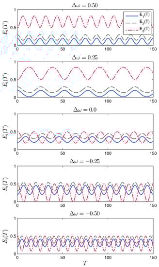For all numerical simulations we used the MatlabTM software along with its standard ODE Suite []. In particular, the standard ode45 solver was employed with stringent error tolerance settings. In Figure 1 we show the energy evolution in the resonant triad given in Table 1 for several values of the frequency detuning ; e.g., in geophysical applications . From these graphs it can be seen that the period and the range of the energy variation, defined as