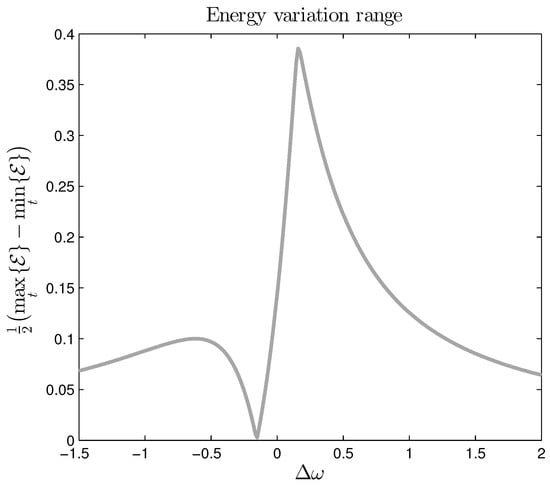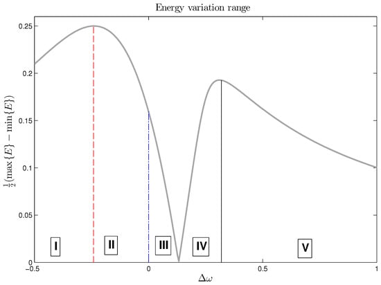 A graph showing the characteristics of the dependency of the energy variation range on the frequency detuning is shown in Figure 2. This particular curve was computed for parameters given in Table 1. The graph can conveniently be divided into the five regions which are separated by particular values of the frequency detuning : correspond to local maxima, is the position of the local minimum, and corresponds to exact resonance. So, the regions are: