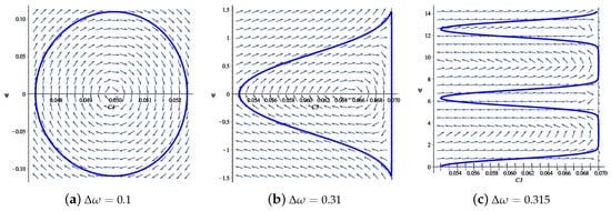 The phase space analysis was performed with MapleTM software. On Figure 4, Figure 5 and Figure 6 we depict the typical phase portraits of the dynamical system of Equations (24)–(28) in phase-amplitude variables. For illustration we choose the triad given in Table 1 with the initial energy distribution (a). In these pictures we represent the high-frequency mode on the horizontal axis, while the dynamical phase is on the vertical.