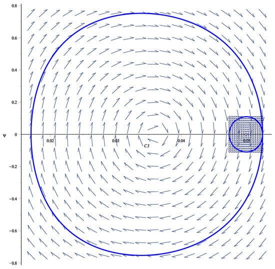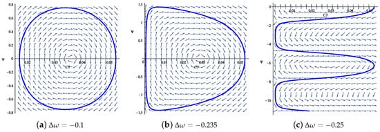 The main finding is a pronounced asymmetry between the phase portraits for positive and negative values of the detuning : the position of the stationary point right on the horizontal axis (there are other stationary points for ) is very different; the shape of the periodic orbit differs (see Figure 4b and Figure 5b); the transition from closed to snake-like integral curves takes place for different values of , e.g., on Figure 4c and on Figure 5c; the shape of the integral curves is different; the phase portraits look alike, but differ in size by one order of magnitude. In order to demonstrate how big this difference is for opposite values of we depicted on the same Figure 6 the periodic cycles from Figure 4a and Figure 5a.