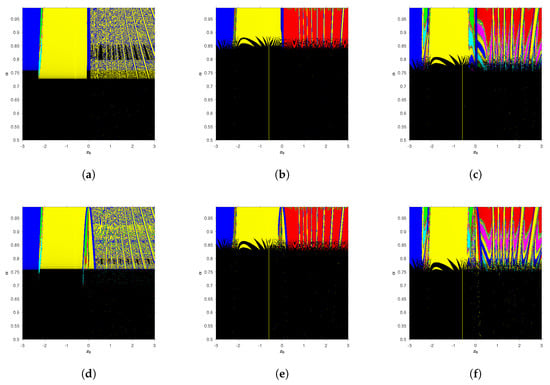 Convergence planes of fractional Newton and Traub-type on with and . (a) CFN1, 47.47% convergence; (b) CFN, 29% convergence; (c) CFT, 44.25% convergence; (d) R-LFN, 47.54% convergence; (e) R-LFN, 29.84% convergence; (f) R-LFT, 45.56% convergence.