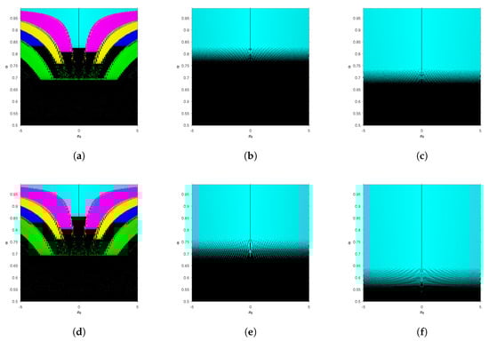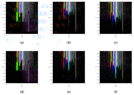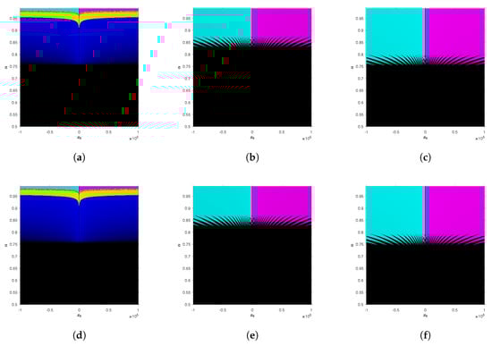 Convergence planes of fractional Newton and Traub-type methods on with . (a) CFN, 30.39% convergence; (b) CFN, 16.46% convergence; (c) CFT, 24.29% convergence; (d) R-LFN, 30.06% convergence; (e) R-LFN, 16.88% convergence; (f) R-LFT, 25.04% convergence.