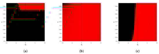 Convergence planes of fractional Newton-type methods on with . (a) CFN, 13.83% convergence; (b) CFN, 99.62% convergence; (c) CFT, 57.78% convergence.