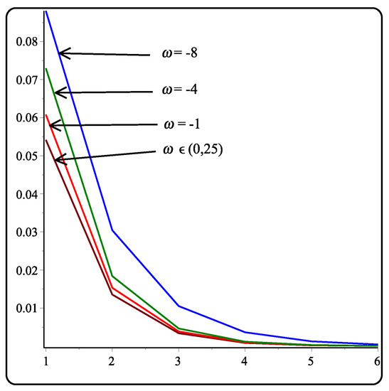 This section presents the error between control polygon and limit curve after kth subdivision level of 5-point binary, ternary, and quaternary subdivision schemes using different values mentioned in Table 1, Table 2 and Table 3 by applying the approach of Hashmi [31]. The error is minimum over the interval , , and for binary, ternary, and quaternary, respectively, and increases on both sides of the intervals. In Table 1, Table 2 and Table 3, it is observed that increases in the arity of the schemes decrease the error of the proposed schemes. Figure 1, Figure 2 and Figure 3 illustrate graphical representation of error. Moreover, the proposed computational cost decreases by increasing the arity of subdivision schemes. Therefore, our experiments show that higher arity scheme are better than the lower arity schemes in the sense of computational cost and error bounds.