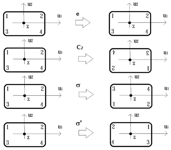 Group is called an abelian group if its binary operation ⊙ is commutative. The number of elements of (its cardinality, ) gives the order of group . In the following, only groups with finite order are considered. An abstract element is the conjugate of the abstract element if with . The set of all the elements that are conjugated to each other forms a conjugacy class , and denotes its cardinality. The number P of conjugacy classes belonging to a given group is . Finally, the sets are disjoint to each other [20,21].