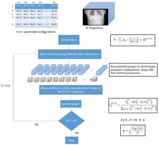 The main idea behind our approach is to solve the reconstruction problem in a sequential manner by adding one projection at a time and using each new projection to measure the prediction error achieved at a given stage of the algorithm for each possible configuration of the hyperparameters. Using the successive prediction errors, the weights assigned to each hyperparameter configuration are updated according to the exponential update rule of []. The algorithm is initialised using a subset of the projections and a filtered back projection approach.