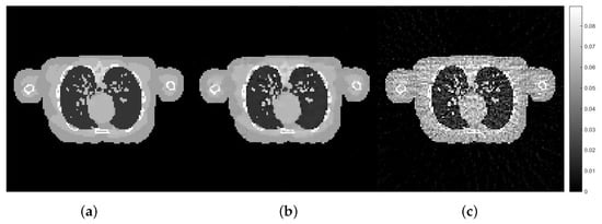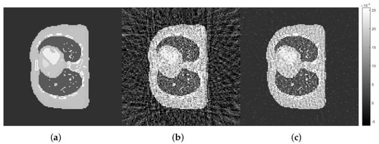 The first experiment to evaluate the proposed Hedge-based hyper-parameter selection approach is implemented by using the projection images simulated from a digital XCAT phantom []. Figure 2 displays the original XCAT phantom data used to simulate the input projection data using the GPU-accelerated forward operator available in the TIGRE toolbox []. The detector size is 512 × 512 pixels, with each pixel’s size of 0.8 mm. The image size is 128 × 128 × 128 voxels with the total size of 256 × 256 × 256 mm. Each image voxel’s size is 2 mm. The Poisson and Gaussian noise [,] has been added to the input projection data for a simulation of realistic noise. This is following the noise model presented in []. The maximum number of photon counts, which represents a white level for photon scattering, is specified as 60,000 from a 16 bit detector with some flat-field correction. The Gaussian noise is added to simulate electronic noise and obtained by a Gaussian random number generator with mean and standard deviation of 0 and 0.5, respectively.
