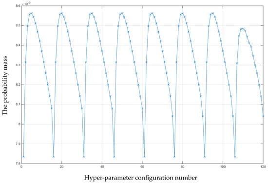 The probability mass of all the hyper-parameter configurations after 25 iterations of the proposed Hedge-based algorithm (T = 25–50).