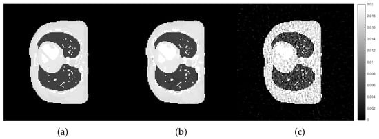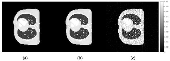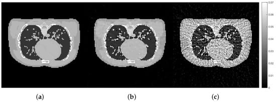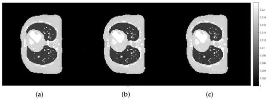 The hyper-parameter controls the strength of the diffusion in the AwTV norm in Equation (1) during each iteration []. Setting this hyper-parameter to a proper value is critical, as it will allow the TV minimisation process to have more influence on removing noise and less influence on preserving edges. The recommended setting of as suggested in our previous work is to set it to approximately the 90th percentile of the histogram of the reconstructed image from the Ordered Subspace-SART algorithm.