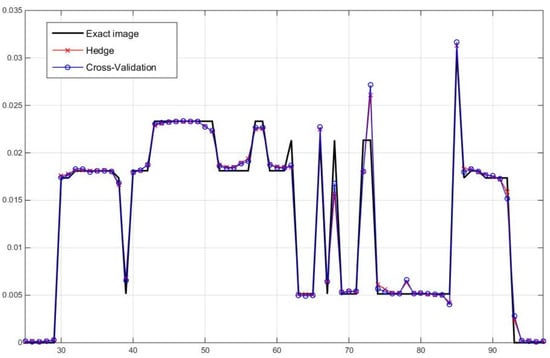 From visual inspection, the reconstruction results from the best hyper-parameters found by two approaches are very similar to each other. They are also relatively close to the exact phantom image, as confirmed by the one-dimensional profile plots in Figure 7. This means that the two approaches are able to identify the hyper-parameters which make the AwPCSD algorithm work efficiently and able to recover important features of the images. Comparing the results from two approaches, there are no important differences that could be visually observed. In order to quantify the differences between the results, the relative 2-norm and the Universal Quality Index (UQI) [,] are computed to explore the performance of the approaches for detailed structure preservation using the following equations:
