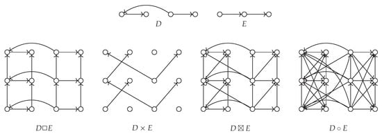 Let D and F be digraphs. Different products of digraphs D and F have, similarly as in graphs, their set of vertices equal to . We roughly and briefly discuss the four standard products of digraphs: the Cartesian product , the direct product , the strong product and the lexicographic product (sometimes also denoted ). Adjacency in different products is defined as follows.