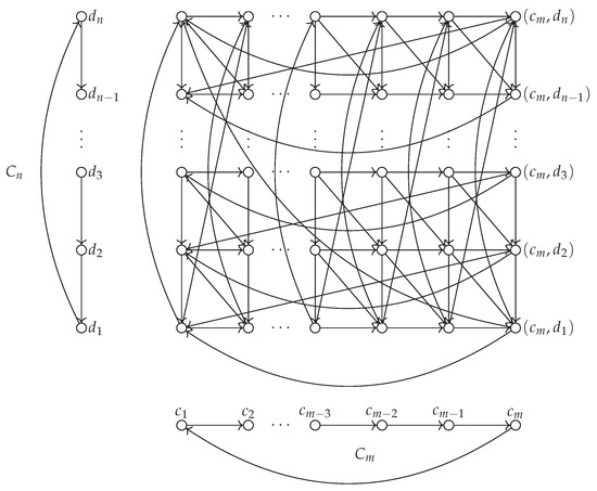 In the rest of this section we use the following notation and orientation for directed cycles and on m and n vertices, respectively, see Figure 3, and with we denote a vertex of a strong product of those two cycles. All operations on the first index i are via and on the second index j are via . We also partition into sets