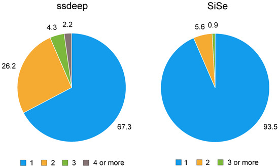 Another difference with respect to ssdeep is that SiSe computes three signatures in each execution loop, with block sizes b, and (in Reference [12] there is a similar technique, but Chen and Wang use b, , , and instead, so our algorithm implements the opposite approach). The reason behind this decision is that the experimental work described in Reference [9] (which employed 15,036 files of several types totalling 3.84 gigabytes) demonstrated that 67.3% of the tested files needed the main loop of the algorithm (i.e., the loop that scans the file at byte level and processes its full content) to be executed once, while 26.2% needed to run the main loop twice, and the rest of the files needed at least three loop executions. In the case of our design, it is possible to choose as leading and secondary signature the ones related to block sizes b and , or to block sizes , and , after any execution of the main loop. With this, it is not necessary to perform any additional loop execution and, consequently, the running time will decrease significantly in some cases. Figure 1 illustrates the difference between ssdeep and SiSe regarding the number of main loop executions for each case.