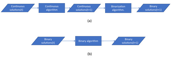 When developing a classification of existing binarization techniques, two large groups [14] are defined. The first group designs an adaptation of a continuous algorithm to work in binary environments. This adaptation usually turns out to be specific to the metaheuristic algorithm and the problem that is being solved. We call this group the specific binarizations. The second group separates the binarization process from the metaheuristic algorithm. Therefore, the latter continues to work in a continuous search space. Once the continuous solutions are obtained, they are binarized. We call this group the generic binarizations. In Figure 1a,b, the generic and specific binarization diagrams are shown.