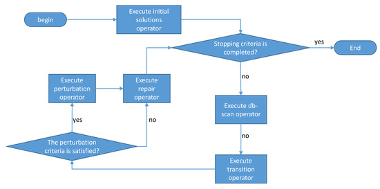 To efficiently solve the MKP, the binary db-scan algorithm is composed of five operators. The first operator corresponds to the initialization of the solutions. This operator is detailed in Section 4.1. After the population of solutions is initialized, the next step is to verify whether the maximum iteration criterion is met. If the criterion is not satisfied, then the binary db-scan operator is used. In this operator, the metaheuristic is executed in the continuous space to later group the solutions considering the absolute value of the velocity and using the db-scan technique. The details of this operator are described in Section 4.2. Subsequently, with the clusters generated by the db-scan operator, the transition operator is used, which aims to binarize the solutions grouped by db-scan. The transition operator is described in Section 4.3. Then, if the solutions obtained do not satisfy all the constraints, the repair operator described in Section 4.5 is applied. Finally, a random perturbation operator is used that is associated with the criterion of the number of iterations that are performed without the best value being modified; this operator is detailed in Section 4.4. The general flow chart of the binary db-scan algorithm is shown in Figure 2.