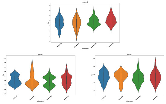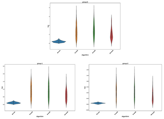 In this section, we develop a comparison between the db-scan and k-means clustering techniques. The k-means technique has been used to obtain binary versions of swarm intelligence algorithms. This technique has been successfully applied to the set-covering problem [50] and to the knapsack problem [29]. Unlike db-scan, k-means needs to set the number of clusters; therefore, this number is a parameter to estimate. In this experiment, the initiation, repair, and perturbation operators were exactly the same, and we only modified the binarization mechanism by replacing db-scan with k-means. In the case of k-means, and guided by the results obtained in [29], the number of clusters k = 5 was used, and we worked with the set of problems to make comparisons. As in the previous experiments, we used three groups: Problems 0–9 as Group 0, 10–19 as Group 1 and 20–29 as Group 2. The results are shown in Table 4 and Figure 4. When we analyze the best known and average indicators, we see that there is very little difference between the results obtained by both techniques. However, when we perform a group analysis, we see that db-scan performs better than k-means in Group 0. The Wilcoxon test indicates that the performance is statistically significant. On the other hand, k-means has a better performance than db-scan in Groups 1 and 2. For Group 1, the difference is not significant, and, in the case of Group 2, it is significant in favor of the algorithm that uses k-means. The violin plot distributions do not show a relevant difference between the algorithms. Visually, it is observed that the interquartile range of the algorithm that uses db-scan obtains better values in Group 0. However, in Group 2, k-means obtains better values. The dispersion is similar in the different groups, and, in Group 0, a greater dispersion is observed for the algorithms that use db-scan.