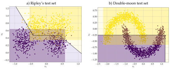 Performance of the dilation-erosion perceptron (DEP) classifier on Ripley’s and double-moon datasets described on Examples 4 and 5. Scatter plot of test data and the decision boundary of DEP classifier. The purple and the yellow regions corresponds respectively to the sets and .