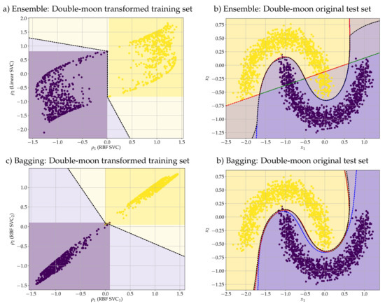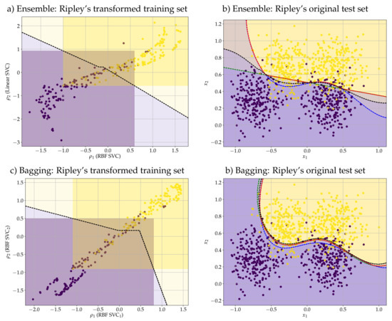 Let us now provide extensive computational experiments to evaluate the performance of the ensemble and bagging r-DEP classifiers. In the ensemble strategy, the mapping is obtained by considering a RBF SVC, a linear SVC, and a polynomial SVC. The bagging strategy consists of 10 RBF SVCs where each base estimator has been trained using a sampling of the original training set with replacement. Let us also compare the new r-DEP classifiers with the original DEP classifier, linear SVC, RBF SVC, the polynomial SVC (poly SVC) as well as an ensemble of the three SVCs and a bagging of RBF SVCs. We would like to point out that we used the default parameters of the python’s scikit-learn API in our computational experiments [65,66].