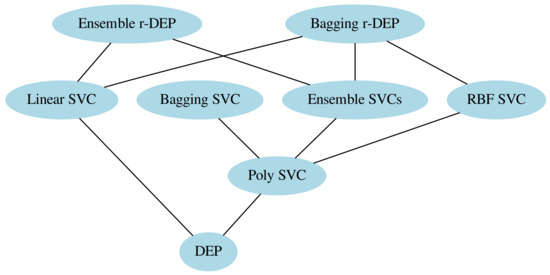 From Table 4, the largest average of the balanced accuracy scores have been achieved by the ensemble and bagging r-DEP classifiers. Using paired Student’s t-test with confidence level at 99%, we confirmed that the ensemble and bagging r-DEP, in general, performed better than the other classifiers. In fact, Figure 5 shows the Hasse diagram of the outcome of paired hypothesis tests [68,69]. Specifically, an edge in this diagram means that the hypothesis test discarded the null hypothesis that the classifier on the top yielded balanced accuracy score less than or equal to the classifier on the bottom. For example, Student’s t-test discarded the null hypothesis that the ensemble r-DEP classifier performs as well as or worst than the hard-voting ensemble of SVCs. In other words, the ensemble r-DEP statistically outperformed the ensemble of SVCs. Concluding, in Figure 5, the method on the top of an edge statistically outperformed the method on the bottom.