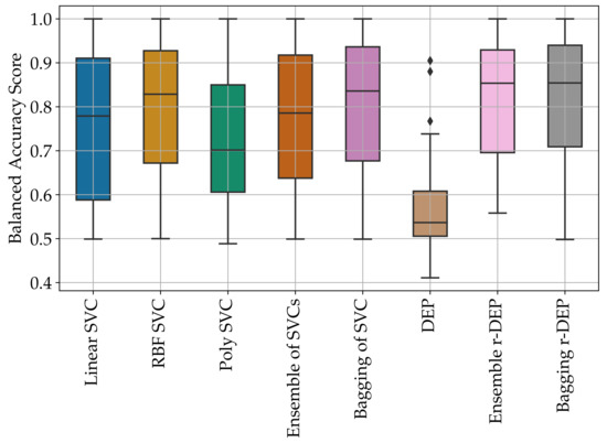 Boxplot summarizing the average balanced accuracy scores provided on Table 4. In general, the ensemble and bagging r-DEP classifiers yielded largest balanced accuracy scores.