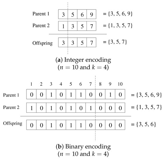 When we solve a problem with GAs, the representation of chromosomes is an important issue. Representation depends on the problem and reflects the properties of the problem. One representation of a solution to MKCP is a vector of k integers representing column indices; another is a binary vector of length n, in which each element indicates whether or not the corresponding column is selected. Thus, when and , the integer representation is equivalent to the binary vector representation . We focus on the integer vector representation.