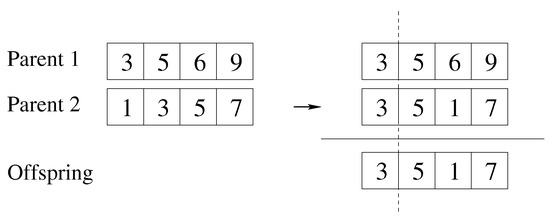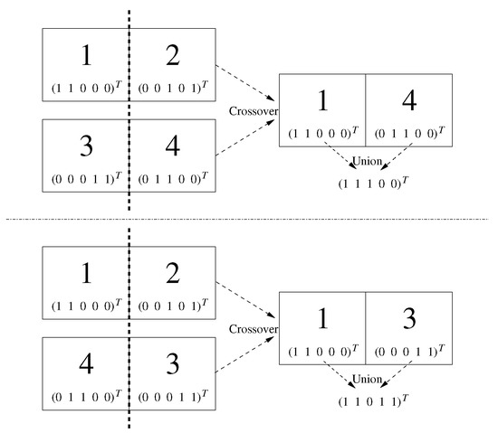 In the context of a genetic algorithm, we would expect chromosomes with genes corresponding to dissimilar columns to be most effective. Looking again at Figure 1, suppose that we apply a standard one-point crossover to the parents and . If the cutting line lies between the first gene and the second one, then the offspring will be , and this offspring covers the rows of A. However, if the second parent is rearranged to , the offspring becomes , which covers . This example is illustrated in Figure 5. In general, we want the offspring to have genes that correspond to columns that are as dissimilar as possible. Thus, it is helpful to rearrange chromosomes so that genes corresponding to similar columns are in the same positions. The goal of this rearrangement can be formulated in terms of distance in the phenotype space . Consider two parents x and y in the genotype space G. Rearranging genes so that those corresponding to the most similar columns are located in the same positions is equivalent to the search for a permutation such that the distance between the equivalence class of x and that of y is equal to the distance between x and . This is also equivalent to finding the which minimizes the distance between x and the permuted y in Equation (2).