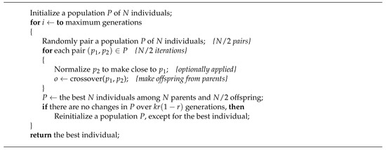 Our underlying evolutionary model is similar to the model of CHC [44], which was applied to many problems [45,46,47,48,49,50]. We paired a population of N chromosomes randomly, and then we applied crossover to each pair, generating a total of offspring. We ranked all parents and offspring and the fittest N individuals among them became the population in the next generation. We used 100 as the size of population in our experiments. We reinitialized the population, except for the best individual, if there were no changes over generations, where r is a divergence ratio that wes set to . This GA stopped after 500 generations and returned the best it has found. The pseudocode of our GA is given in Figure 8.