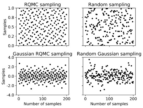 It is difficult to analyze the accuracy of the approximation by QMC in practice as the points are regular. Therefore, randomized QMC (RQMC) can be used so that every element of the sequence is uniformly distributed over the unit cub but still has a low-discrepancy property [35,36,37]. Figure 1 shows the first 200 samples of the sequences for RQMC sampling, pseudo-random sampling, and the corresponding Gaussian sampling with a Sobol sequence. The SQMC algorithm is presented in Algorithm 2.