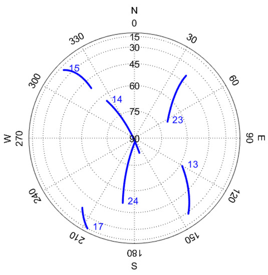 Observed Russia’s Global Navigation Satellite System (GLONASS) satellites shared by the two stations of baseline GOP6_GOP7 at GPST 9:00–10:00 a.m. on day of year (DOY) 180 of 2018. The satellite slot numbers in blue color are marked at the beginning of the satellite trajectories.