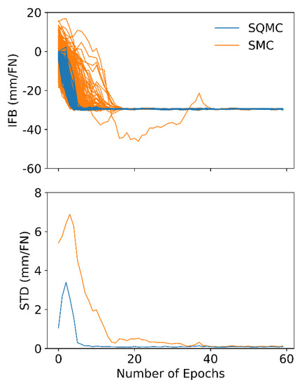 Obviously, both approaches could successfully estimate the IFB values. After convergence, the estimates of the two algorithms were very similar, such as the results after epoch 40th. However, the estimates of the SQMC-based algorithm converged faster than those of the SMC approach, and the corresponding SD was much lower at the beginning. In the worst case of the 1000 estimates, the results converged, i.e., became close to the true value with a difference smaller than 1.5 mm/FN at the seventh epoch for SQMC and at the 40th epoch for SMC.