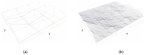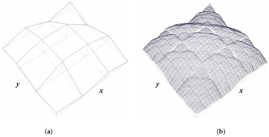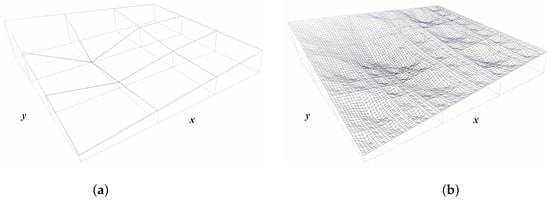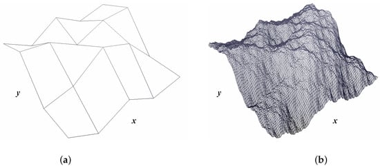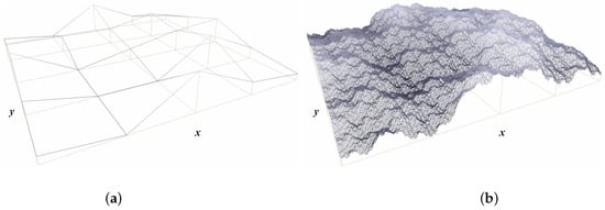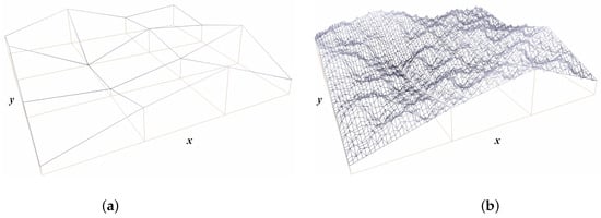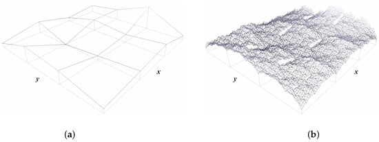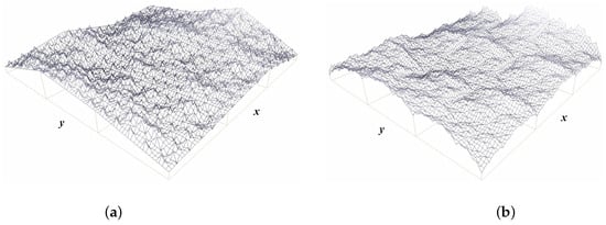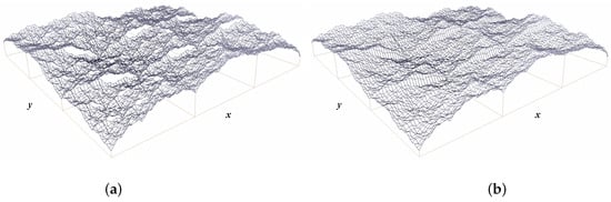 () All vertical scaling factors vanish. If for all and , the join-up conditions are automatically satisfied. Figure 4a illustrates the surface graph (Level = 0) drawn with the original set of data given in Figure 2 of []. In Figure 4b a (fractal) interpolation surface using the standard, in view of Equation (8), bivariate construction is illustrated, where for all , and Level = 4.