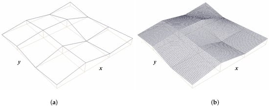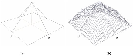 Figure 8a illustrates the surface graph (Level = 0) drawn with the original set of data given in Figure 3 of []. In Figure 8b a fractal surface using the standard, in view of Equation (8), bivariate construction is illustrated, where for all , and Level = 4. In this example, the obtained interpolant is not continuous because neither of the conditions for obtaining the continuous interpolant is satisfied.