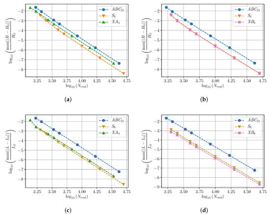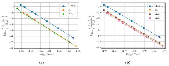 With , and starting from the initial position with initial velocity , we integrate with the different numerical schemes until the final time and compute the error in energy and angular momentum along the integration interval. As reference solution we take the output generated by the standard routine DOP853 based on a Runge–Kutta method of order 8 with local error estimation and step size control (with a very stringent tolerance) []. In this way, we obtain Figure 1 (top and bottom, respectively), where this error is depicted in terms of the number of the computed sub-flows (by taking different time-steps). For clarity, here and in the sequel, in the left panel we include the results attained by the most efficient XA method, whereas the right panel corresponds to the XB schemes. For reference and comparison, we include in all cases the splitting method Equation (9) proposed in [] (denoted here as ABC) and the scheme S, whose coefficients are collected in Table 2.