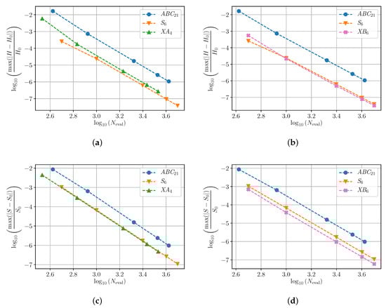 Relative error in conserved quantities for the DDNLS system due to each of the best numerical methods tested. (a) Relative error in energy for XA compared to ABC and S. (b) Relative error in energy for XB compared to ABC and S. (c) Relative error in norm for XA compared to ABC and S. (d) Relative error in norm for XB compared to ABC and S.