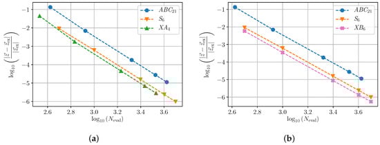 Relative error in the space for charged particle under Lorentz force. The notation is the same as in Figure 1. (a) Relative error in the space for XA compared to ABC and S. (b) Relative error in the space for XB and XB compared to ABC and S.