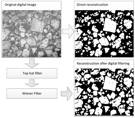 In this step, a combination of top-hat filter [21] and Wiener filter [22] is applied to improve the quality of digital images. The top-hat filter is utilized to correct the uneven illumination, and the Wiener filter is used to reduce the noise created during capturing image. It should be noted that the true image of microstructure described by function cannot be captured accurately without any noises. Actually, the captured image is a special mapping of the true image with some digital noises and finally is represented by the function of . For convenience, the mapping function and the noise function are assumed to be independent from the . Therefore, the captured image function is as follows: