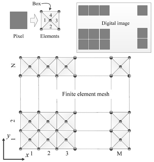 In this step, a smoothed image is mapped into FE mesh. Different from the one-to-one pixel/voxel-based mesh, each pixel of image is mapped into a box with four triangular elements in FE meshes. The schematic of the one-to-four mapping is shown in Figure 2. It should be notice that the linear triangular element is adopted in the present work. Although the quadratic element is better suited to present complex geometries and bending deformations. The linear element is easier to implement and takes less computational cost than the quadratic element. Moreover, the present method can be extended to quadratic element by adding the mid-side nodes easily.