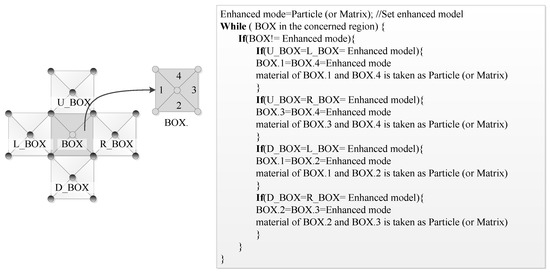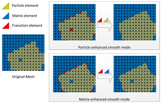It is obvious that the first smoothing process has restored the true image as accurately as possible. However, even if a true image is used in the reconstruction, rough meshes at interfaces still cannot be avoided. In this step, the second smoothing process of FE mesh is introduced to improve the rough interfaces. The main idea is that some triangular elements with particle/matrix properties around the interfaces are selected as transition elements, and the material properties of the transition elements are replaced by the material property of matrix/particles. After this smoothing process, the rough meshes are remarkably improved by enlarging the angles between elements from to . Two different smoothing modes with the enhancement of particle or matrix are illustrated in Figure 3, respectively. It can be observed that the transition elements used in different modes are completely differently. Therefore, a universal pseudocode of the smoothing algorithm is illustrated in Figure 4. Firstly, the enhanced mode should be selected as either particle or matrix. Then, transition elements around interfaces are marked, and the properties of these elements are changed into the enhanced property.