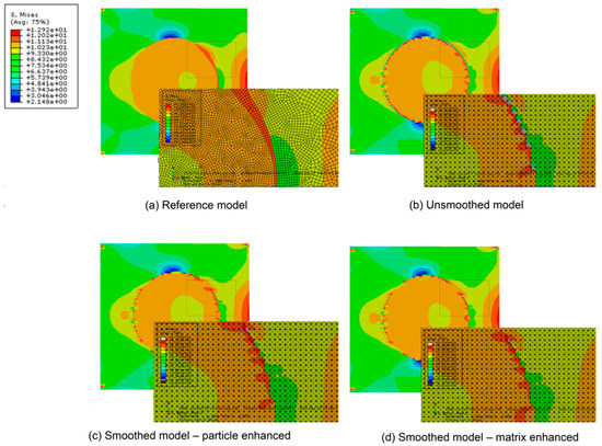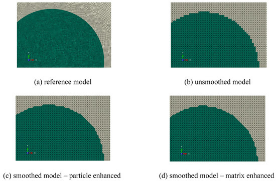Comparison of four mesh modes: (a) reference model; (b) unsmoothed model; (c) smoothed model-particle enhanced; (d) smoothed model-matrix enhanced.