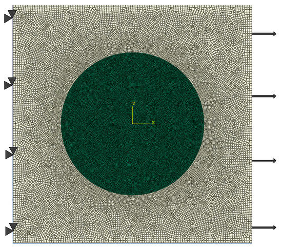 In the following analysis, all the freedoms of nodes on the left boundary is fixed, and a uniaxial tension loading along x+ direction is applied on the right boundary, as shown in Figure 6. The length of each edge is 1, and the maximum element size is 0.01. The reference model contains 11,500 linear quadrilateral elements, and the other models contain 40,000 linear triangular elements, respectively. The elastic modulus ratios of particle Ep to matrix Em is Ep/Em = 5.0, and the Poisson’s ratios of particle and matrix are 0.25. The static analysis is performed in ABAQUS to compare the stress distribution in these models.