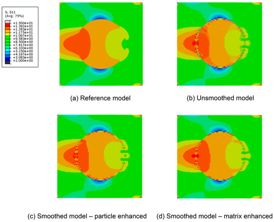 x-directional stress distributions: (a) reference model; (b) unsmoothed model; (c) smoothed model-particle enhanced; (d) smoothed model-matrix enhanced.