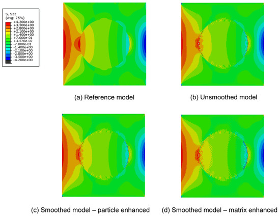 y-directional stress distributions: (a) reference model; (b) unsmoothed model; (c) smoothed model-particle enhanced; (d) smoothed model-matrix enhanced.