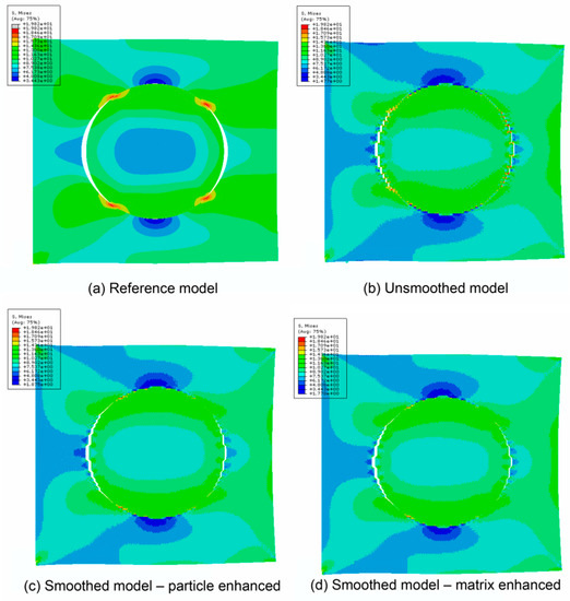 The normalized von Mises stresses along the particle–matrix interface of these four models are illustrated in a polar coordinate system in Figure 10. The radial distances in these curves represent the normalized stress. It can be observed that the stresses in the unsmoothed model are very different to other ones. While the maximum in the smoothed models and the referenced one are around 1.0, the maximum in the unsmoothed model almost reaches 1.3, i.e., 30% higher than the referenced value. Moreover, at most regions along the interface, stress values in the unsmoothed model are much higher than those in the referenced model. However, the stress value in smoothed models (especially in the “Smoothed-P” model), agree well with the result in the referenced model.