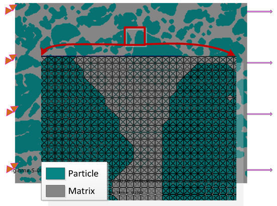 Polymer binder explosive is a special particle-reinforced material with polymeric matrix and crystal particles. Some researches [10,23] indicate that the sizes, shapes, and distributions of particles influence the damage growing. Therefore, an accurate image-based reconstruction method is very significant for investigating damage following. In this section, the unsmoothed and “smoothed-P” models are adopted to simulate the damage state of this material under quasi-static loading. A digital image in Ref. [24] is utilized to reconstruct the FE model, as shown in Figure 12. The material parameters and cohesive elements’ properties are according to Ref. [10].