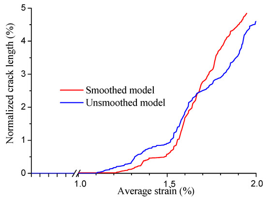Here, the damage increase is evaluated by the total length of cracks. For convenience, the total length in each model is normalized by dividing the whole interface length. The normalized lengths of cracks at different time are illustrated in Figure 13. It can be observed that at the beginning of the crack initiation, the crack length represented by the unsmoothed model is longer than that in smoothed one. This is because, in the unsmoothed model, the bigger level of stress concentration leads to earlier crack initiations. However, with the growth of cracks, the total crack length in the smoothed model becomes greater than that in the unsmoothed one.