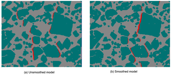 The cracks due to debonding at the end of the simulation are shown in Figure 14. It can be observed that not only the crack lengths in these two models are different but also the distributions of the cracks are different. The cracks in the unsmoothed model are more dispersive than that in the smoothed model. According to the above analysis, cracks initiated relatively more easily in the unsmoothed model due to the stress concentrations. However, the rough boundary in the unsmoothed model provides more resistance during the crack propagation. Since the initiated cracks cannot fully propagate, many dispersive cracks appear in the unsmoothed model. Meanwhile, once cracks initiate in the smoothed model, they can fully propagate with less external resistance caused by the rough meshes. Therefore, the simulations with the smoothed models are closer to the actual conditions than unsmoothed ones.