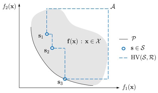 The performance assessment of a multi-objective optimization algorithm can be established in terms of convergence and diversity: the former is related to the distance between and , whereas the latter deals with the wideness and the spread of . A suitable convergence-diversity metric is the HV []. It provides the (hyper)volume dominated by the solution set , evaluated as follows
