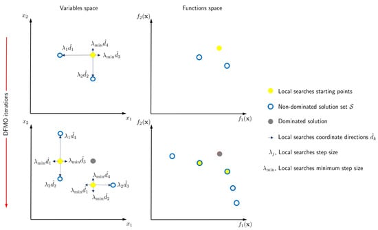 At each iteration (see Figure 2), from each point , DFMO starts a line-search along a suitably generated direction . If such a direction is able to guarantee “sufficient” decrease, then a “sufficiently” large step along this direction is performed, allowing to (possibly) improve .